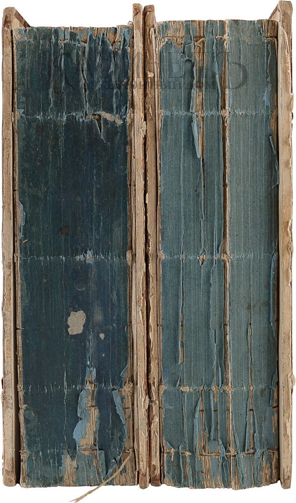 Экземпляр в старинных полукожаных переплетах. Утрачены корешки обеих книг. Крышки отходят от блока. Утрачены титульный лист, содержание, первые 4 листа первой части. В первом томе тетради плохо скреплены. Следы от частого перелистывания страниц. Во втором томе первые две тетради отходят от блока.