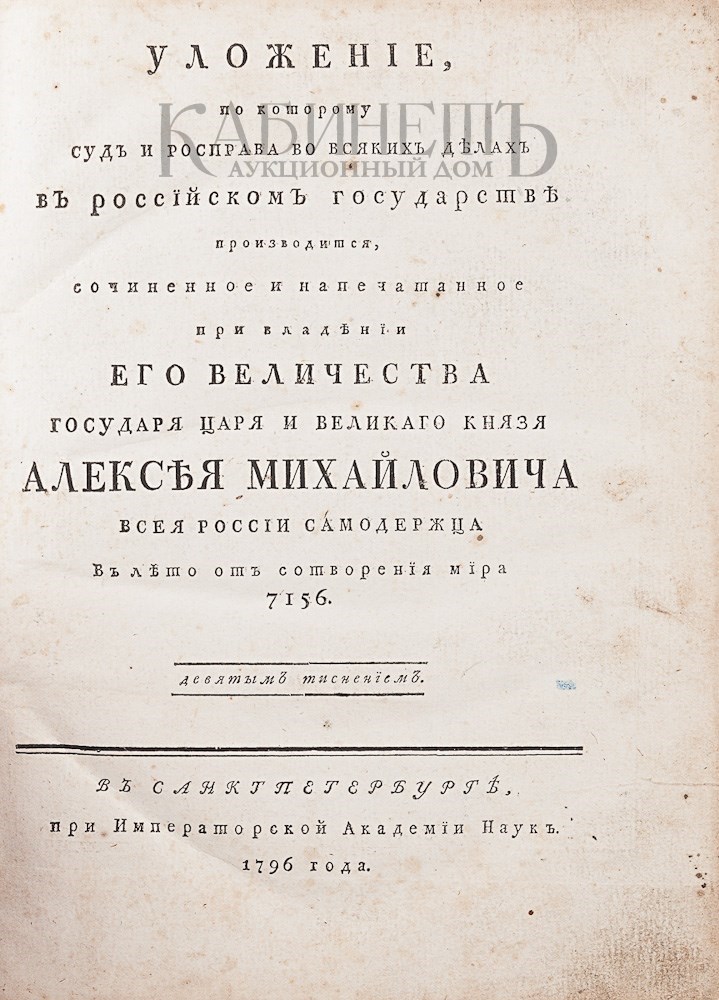 Уложение, по которому суд и расправа во всяких делах в российском государстве производится, сочиненное и напечатанное при владении Его Величества Государя Царя и Великого Князя Алексея Михайловича Всея России Самодержца. В лето от сотворения мира 7156. Девятым тиснением. [СПб.], при Императорской Академии Наук, 1796.