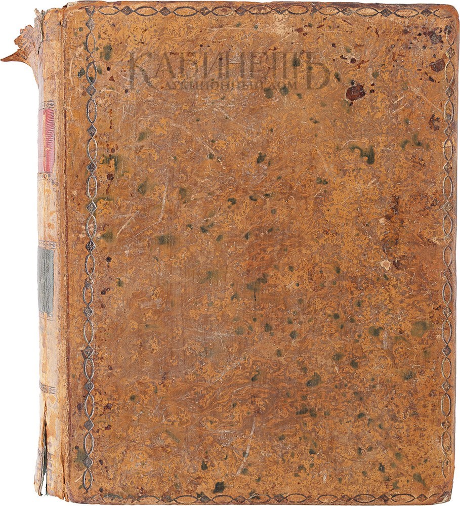 Экземпляр в старинном цельнокожаном переплете с золотым тиснением по корешку и верхней крышке. Надрыв схемы. Лисьи пятна. Корешок отходит от блока. Надрывы по корешку. Потертости переплета. Утрата небольших фрагментов корешка. На форзаце наклеен художественный экслибрис. След от содранной наклейки на левом форзаце.