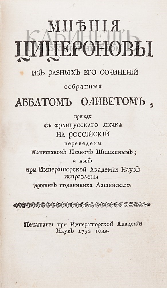Мнения Цицероновы из разных его сочинений собранные аббатом Оливетом прежде с французского на российский язык переведены Капитаном И. Шишкиным, а ныне при Императорской Академии Наук исправлены против подлинника Латинского. [СПб.], печатаны при Императорской Академии Наук, 1752.