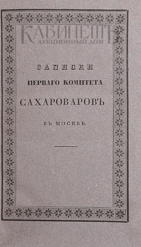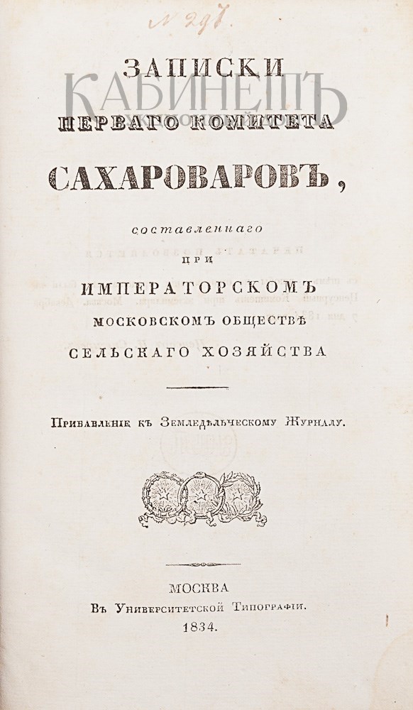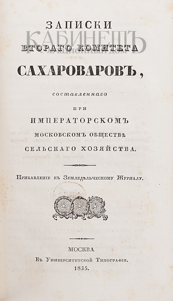 1) Записки первого комитета сахароваров, составленного при Императорском московском обществе сельского хозяйства. Прибавление к Земледельческому Журналу. М., В Университетской Типографии, 1834.