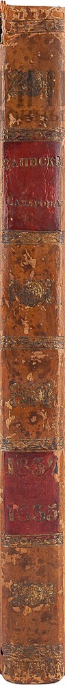 Экземпляр в старинном полукожаном переплете с золотым тиснением по корешку, в хорошей сохранности, незначительный разломчик в самой верхней части корешка.