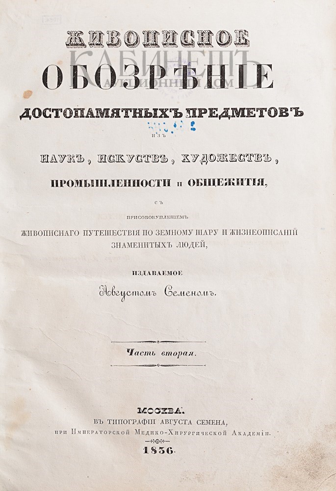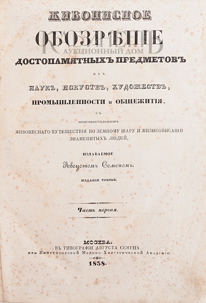 2) Живописное обозрение достопамятных предметов из наук, искусств, художеств, промышленности и общежития, с присовокуплением живописного путешествия по земному шару и жизнеописаний знаменитых людей, издаваемое Августом Семеном. Часть I. М., в типографии Августа Семена, при Императорской Медико–Хирургической Академии, 1838.