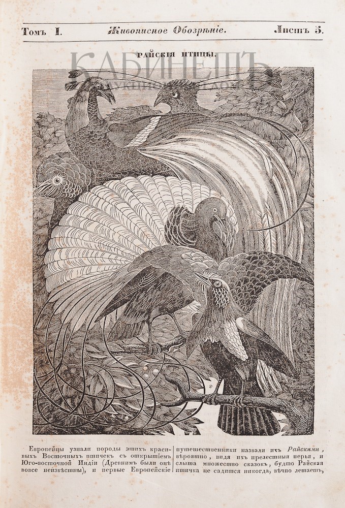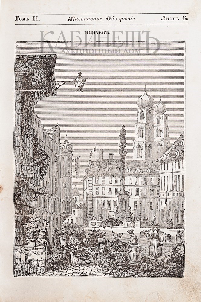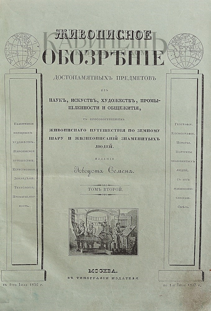 1) Живописное обозрение достопамятных предметов из наук, искусств, художеств, промышленности и общежития, с присовокуплением живописного путешествия по земному шару и жизнеописаний знаменитых людей, издаваемое Августом Семеном. Часть II. М., в типографии Августа Семена, при Императорской Медико–Хирургической Академии, 1836.
