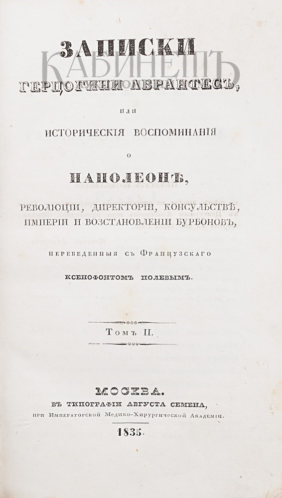 Записки герцогини Абрантес, или исторические воспоминания о Наполеоне, революции, Директории, консульстве, Империи и восстановлении Бурбонов, переведенные с Французского Ксенофонтом Полевым. В 16 томах. М., в типографии Августа Семена, 1835 -1839.