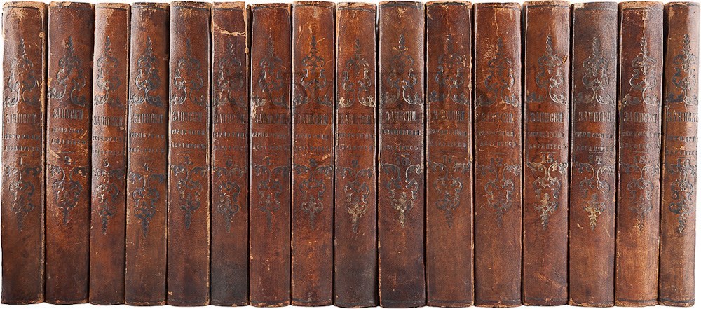 Экземпляр в старинных полукожаных переплетах с золотым тиснением по корешкам, незначительные потертости переплетов, сохранность очень хорошая.