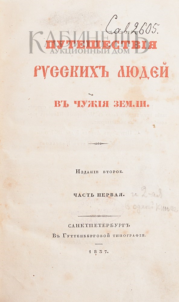 [Сахаров И.]. Путешествия русских людей в чужие земли. В двух частях в одной книге. Издание второе. СПб., в Гуттенберговой типографии, 1837.