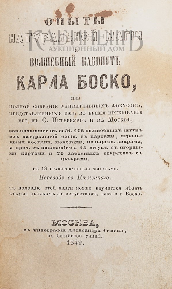 Экземпляр в современном полукожаном переплете с золотым тиснением по корешку и крышкам. Загрязнение титульного листа и авантитула. Профессиональная реставрация титульного листа и авантитула. Владельческие пометки орешковыми чернилами на титульном листе и авантитуле. На первом листе оглавления выдавленный экслибрис: «Алексей Платонович Тарановский». Лисьи пятна, большие пятна желтого цвета на последних листах книги.
