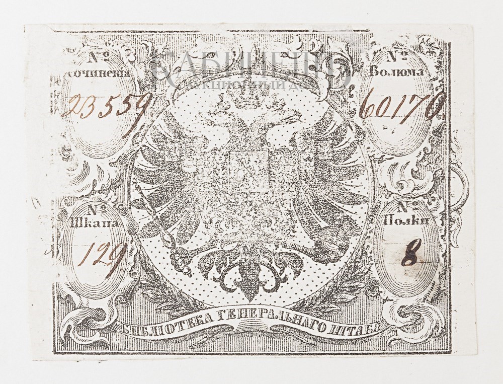 Экземпляр в старинном коленкоровом переплетете, на форзаце расположен экслибрис: «Библиотека генерального штаба».