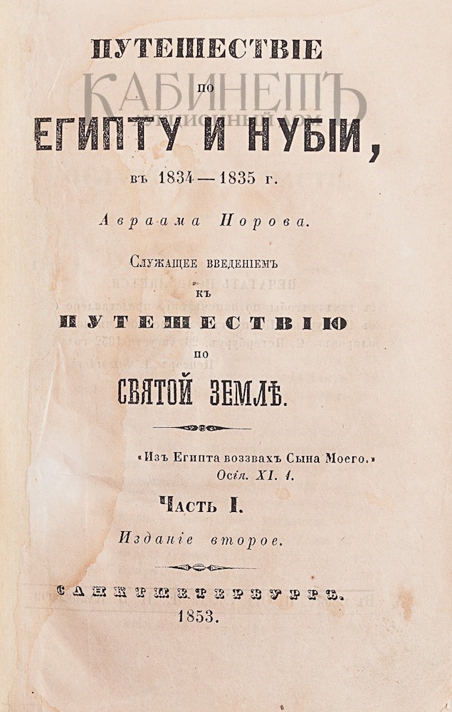 Норов А. Путешествие по Египту и Нубии, в 1834 – 1835 г. Служащее введением к путешествию по Святой земле. Издание второе. В 2-х частях, в одной книге. СПб., в типографии III отделения Собственной Е. И. В. Канцелярии, 1853.