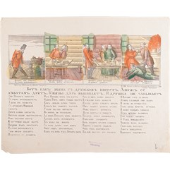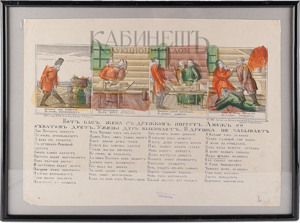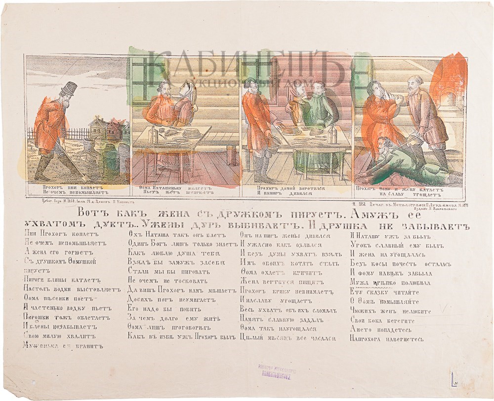 Русская лубочная картинка «Вот как жена с дружком пирует, а муж ее ухватом дует». М., издание Н. Покровского, печатано в Металлографии П. Лукьянова, 1858.