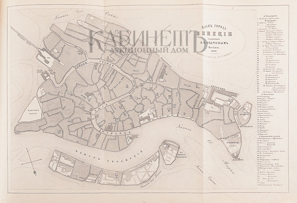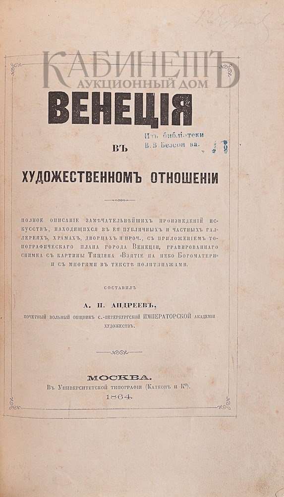 Венеция в художественном отношении. Полное описание замечательнейших произведений искусств, находящихся в ее публичных и частых галереях, храмах, дворцах и прч., с приложением топографического плана города Венеции, гравированного снимка с картины Тициана «Взятие на небо Богоматери» и со многими в тексте политипажами. М., в Университетской типографии, 1864.
