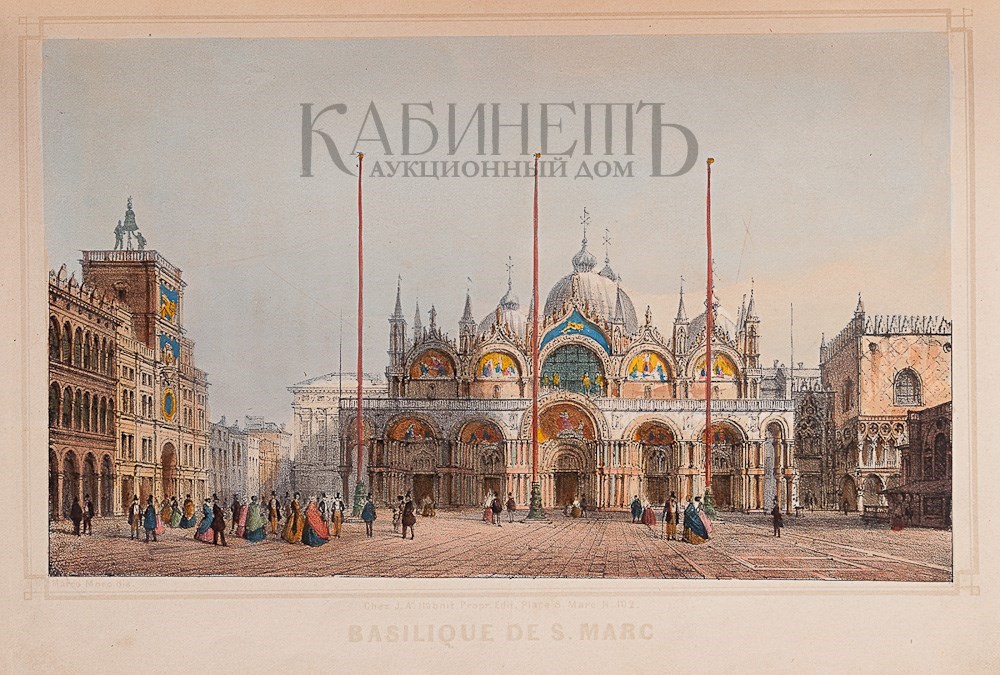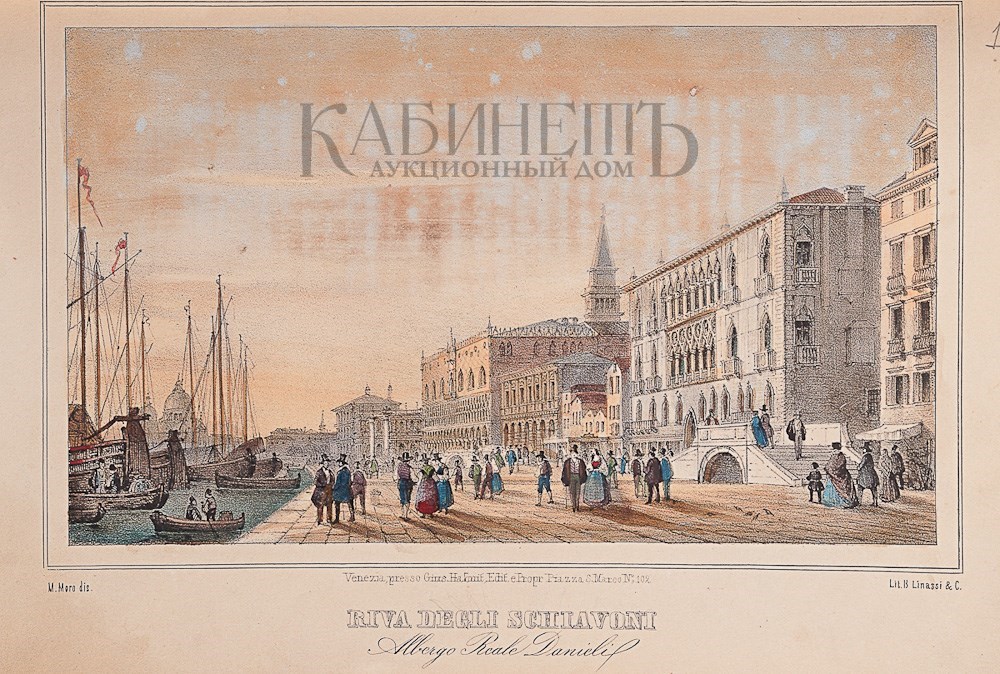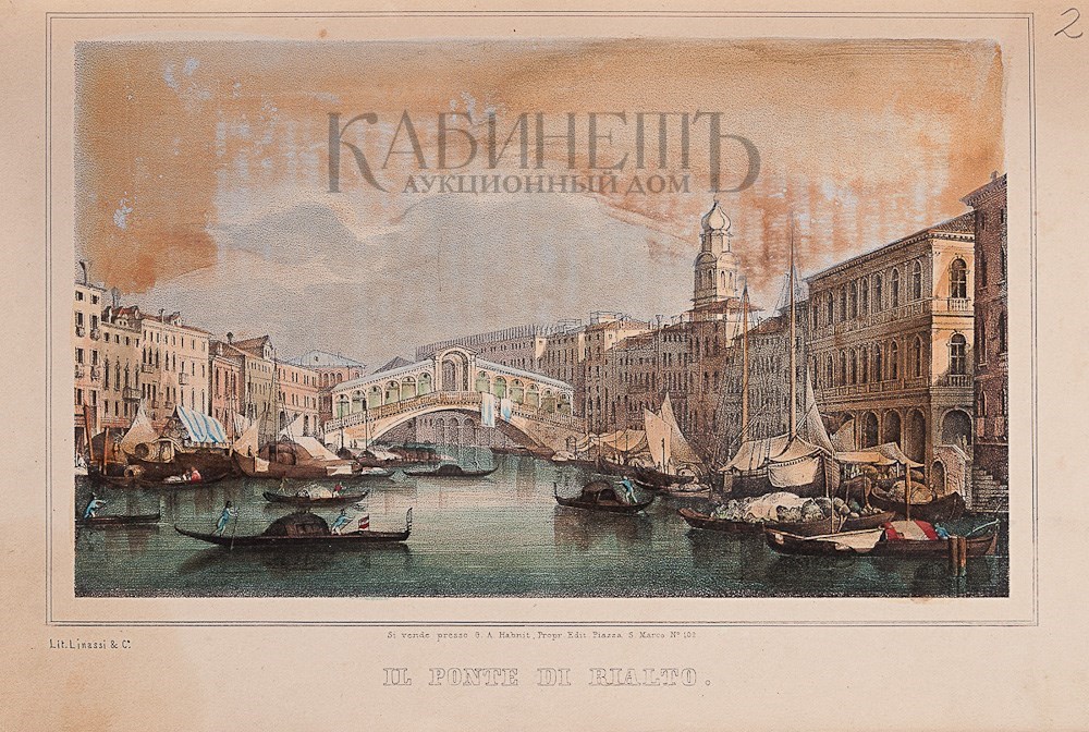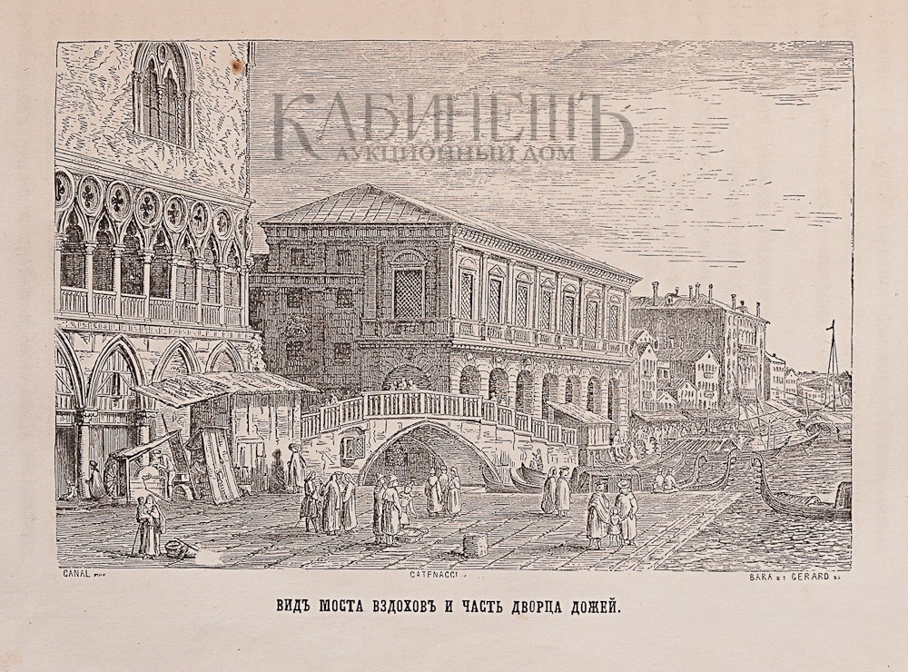 Экземпляр в старинном полукожаном переплете с золотым тиснением по корешку, в книгу вплетены дополнительно литографии с видами Венеции, раскрашенные от руки акварелью.