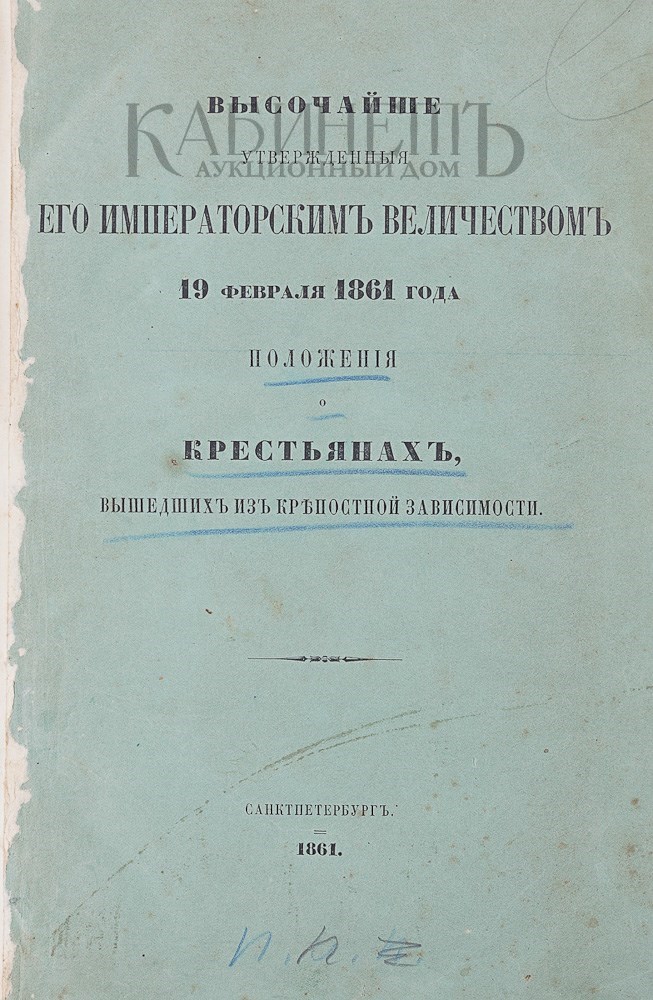 Высочайше утвержденные Его Императорским Величеством 19 февраля 1861 года положения о крестьянах, вышедших из крепостной зависимости. СПб., 1861.