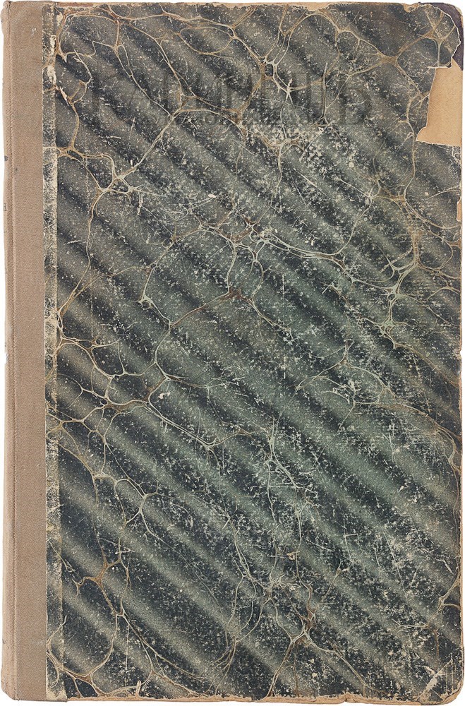 Потертости переплета, утрата фрагмента верхней крышки, лисьи пятна на некоторых страницах. Разлом по корешку внутри переплета. Замятие нескольких страниц.