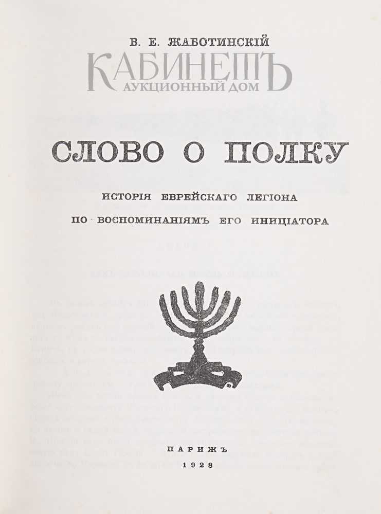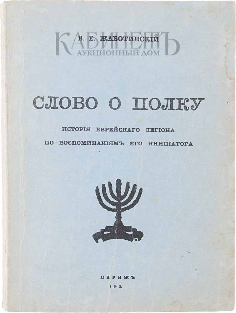Жаботинский В.Е. Слово о полку. История еврейского легиона по воспоминаниям его инициатора. Париж, типография «Voltaire», 1928.
