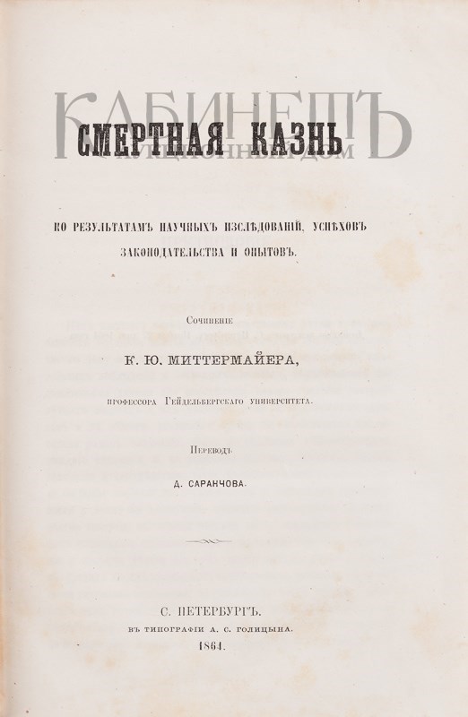 Экземпляр в старинном глухом тканевом переплете с кожаной золототисненной наклейкой на корешке. Под переплетом сохранены обе издательские бумажные шрифтовые обложки. Пятна и владельческие пометы на верхней обложке (орешковые чернила), загрязнения некоторых страниц, отдельные страницы подклеены к блоку.