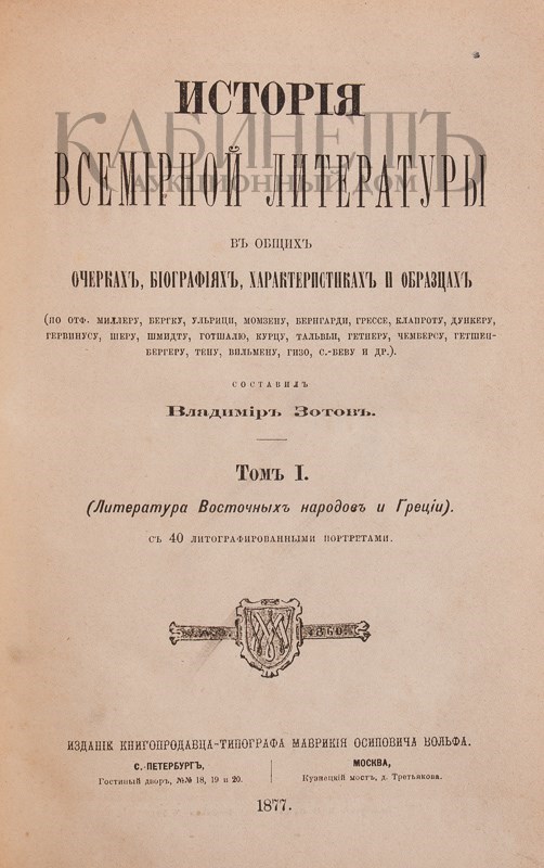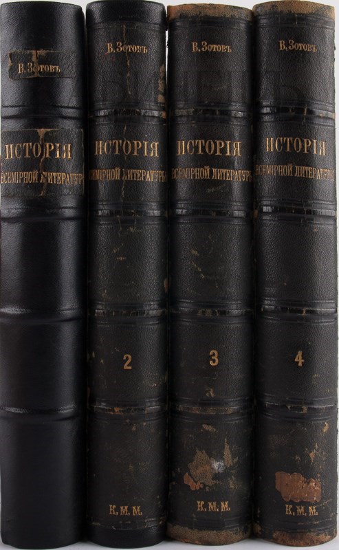 Зотов В. История Всемирной литературы в общих очерках, биографиях, характеристиках и образцах. В 4-х томах. СПб. – М., издание книгопродавца-типографа Маврикия Осиповича Вольфа, 1877 – 1882.