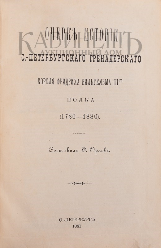 Орлов Ф. Очерк истории С.-Петербургского гренадерского короля Фридриха Вильгельма III- го полка (1726 – 1880). СПб., в Типографии Второго Отделения Собственной Е. И. В. Канцелярии, 1881.