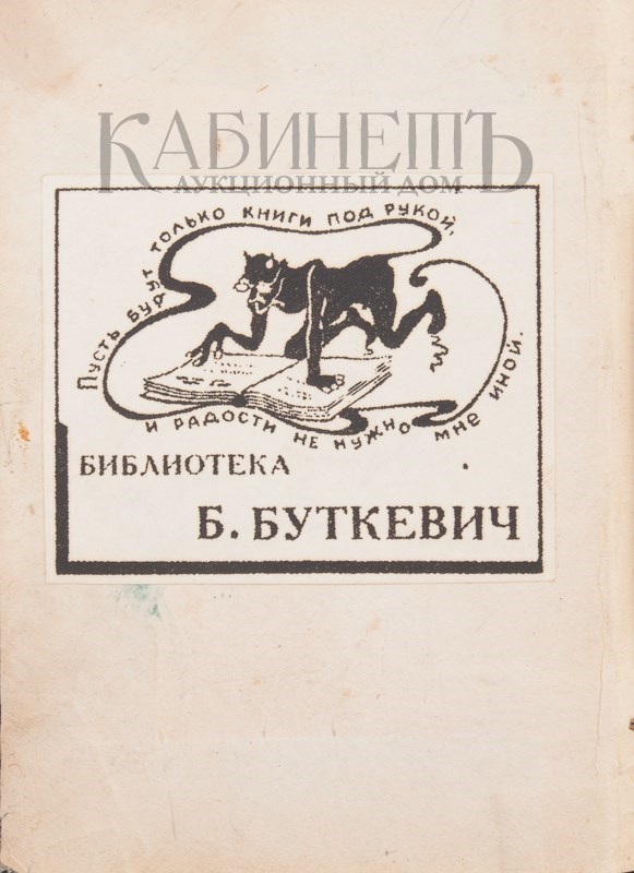 Экземпляр в старинном владельческом переплете, коленкоровый корешок и картонажные крышки, обклеенные мраморной бумагой, на титульном тисте владельческая пометка орешковыми чернилами, на форзаце экслибрис: «Библиотека Б. Буткевича».