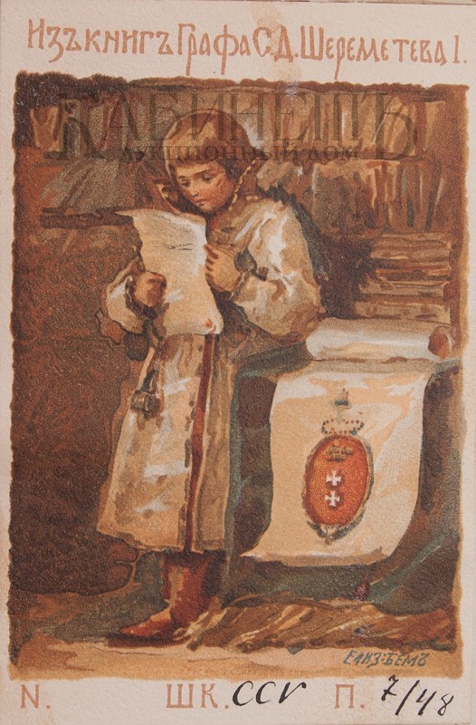 Экземпляр в старинном полукожаном переплете с золотым тиснением по корешку, потертости переплета, а форзаце расположен экслибрис работы Е. Бем: «Изъ книгъ Графа С.Д. Шереметева», на корешке суперэкслибрис.