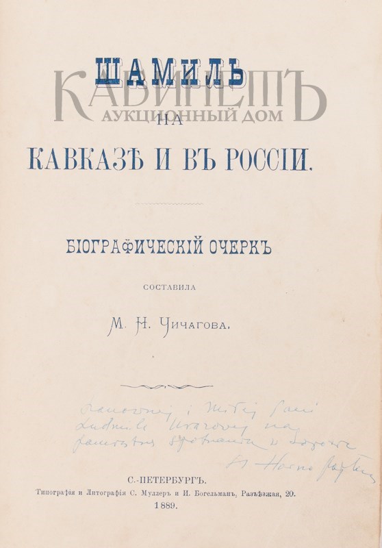 Чичагова М.Н. Шамиль на Кавказе и в России. Биографический очерк. СПб.., тип. и лит. С. Муллер и И. Богельман, 1889.