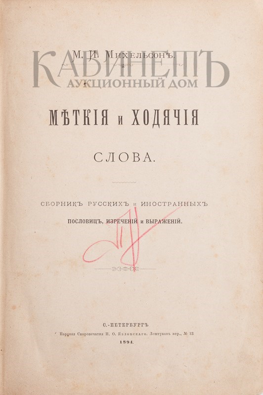 Экземпляр в издательском коленкоровом переплете с золотым тиснением по корешку и крышкам. На титульном листе пометка красным карандашом. Утрата маленького фрагмента нижнего края стр. 81. На нахзаце расположен экслибрис книжной торговли В. Клочкова.