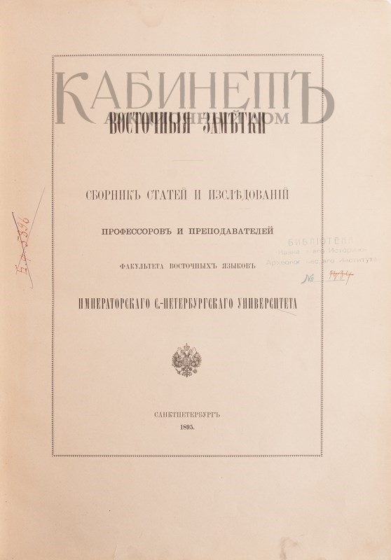 Экземпляр в современном полукожаном переплете с золотым тиснением п корешку. На титульном листе дореволюционный штамп, пометки орешковыми чернилами.