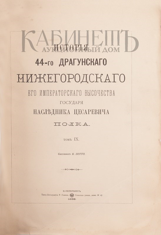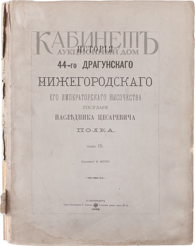 Потто В. История 44-го Драгунского Нижегородского Его Императорского Высочества Государя Наследника цесаревича полка. Том XIX. СПб., Типолитография Р. Голике, 1895.