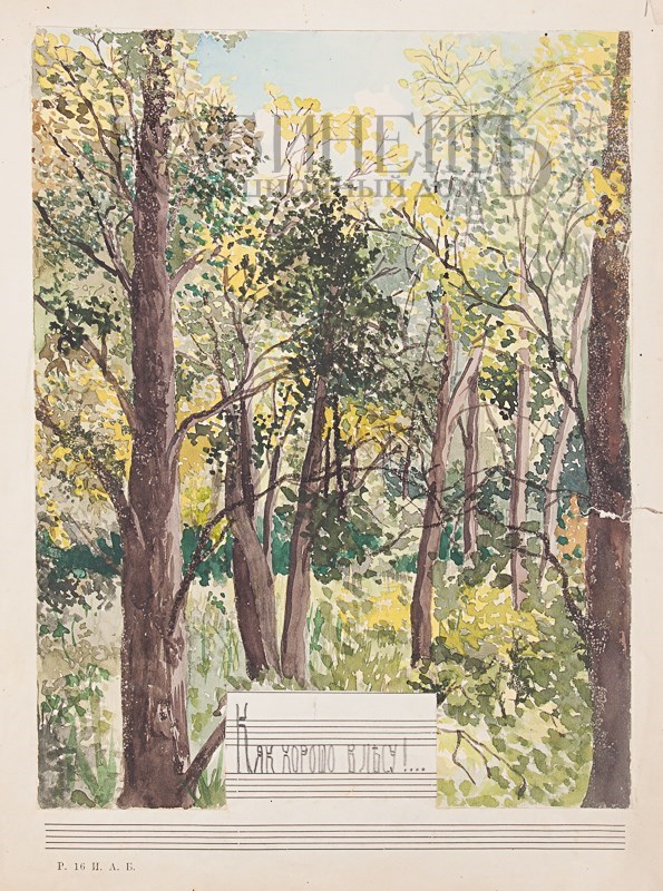 Экземпляр на нотной бумаге, на верхний лист наклеена работа акварелью.