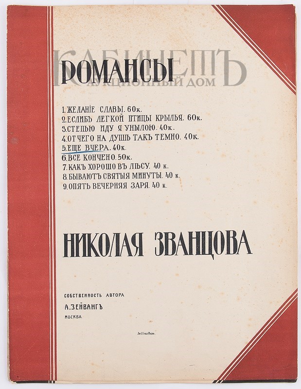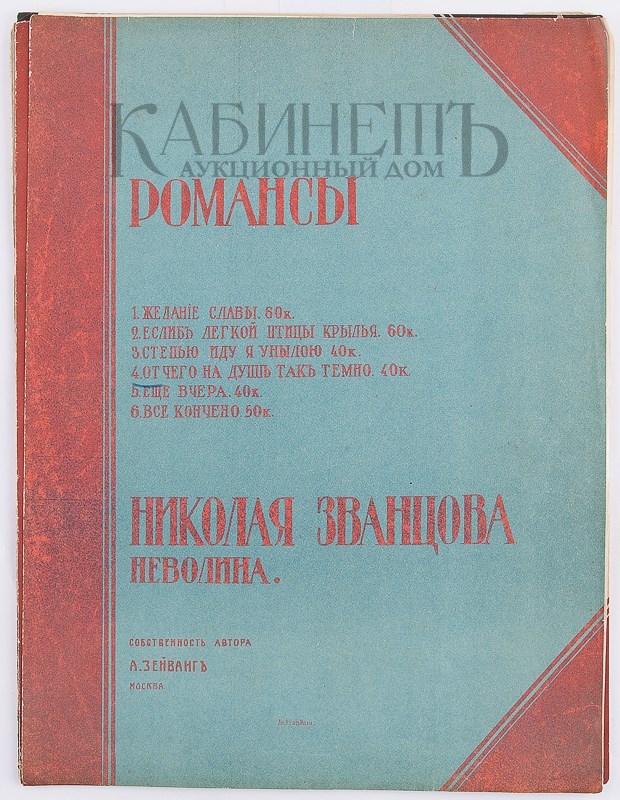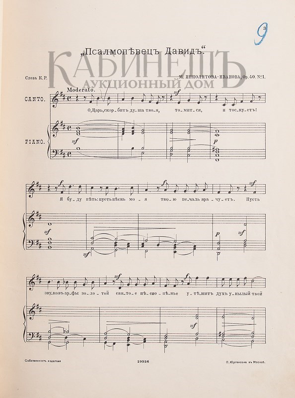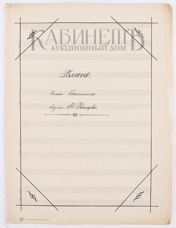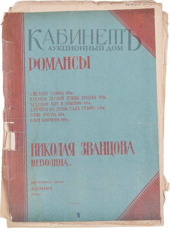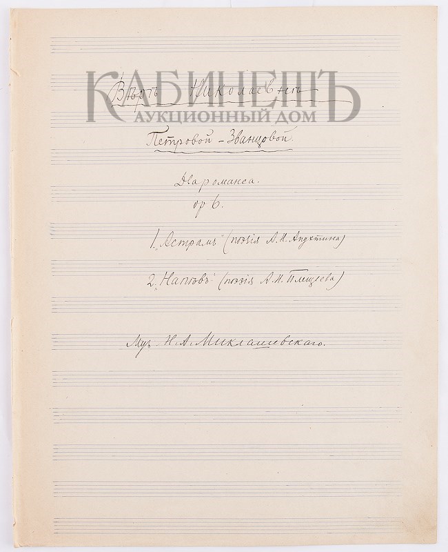 3) Подборка из 9 изданий партитур композиторов Званцова Н., Миклашевского Н., Ипполитова-Иванова М. Рукописные и печатные ноты романсов композиторов на слова А. Апухтина, А. Плещеева, Великого князя Константина Романова, К. Бальмонта, [конец 1800 – начало 1900 гг.].