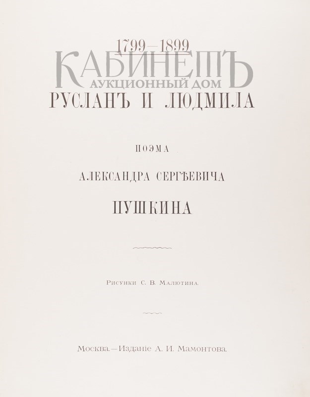 Пушкин А.С. 1799–1899. Руслан и Людмила. Поэма Александра Сергеевича Пушкина. Рисунки С.В. Малютина. М., издание А.И. Мамонтова, 1899.
