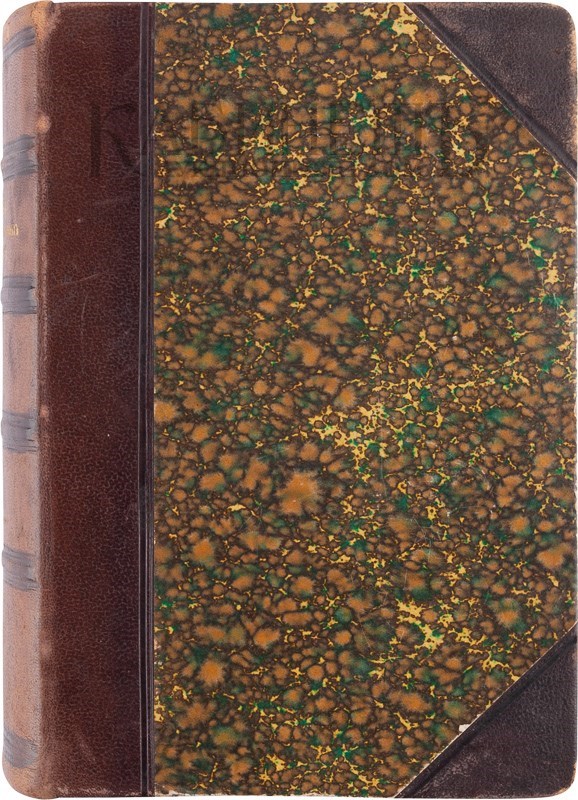 Экземпляр в старинном полукожаном переплете с бинтами и золотым тиснением по корешку. Тонированная «головка». Мраморированный обрез. Форзацы из бумаги растительного орнамента. Незначительные потертости переплета.
