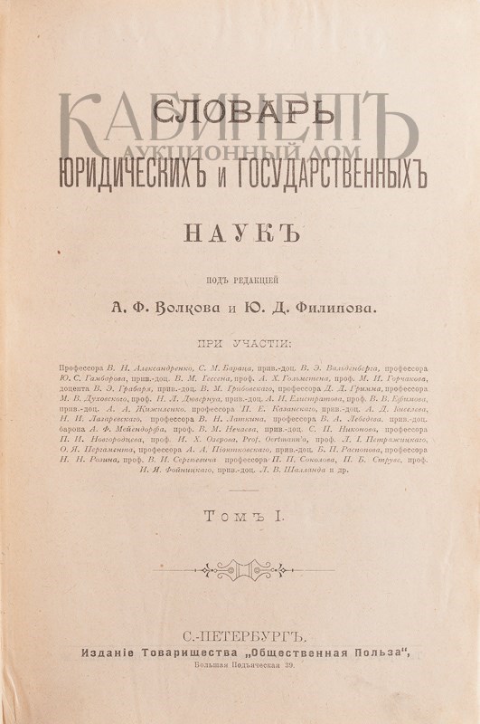 Словарь юридических и государственных наук, под редакцией А.Ф. Волкова и Ю.Д. Филиппова. В 2 томах, в 6 выпусках. СПб., издание товарищества «Общественная польза», [1901-1902].
