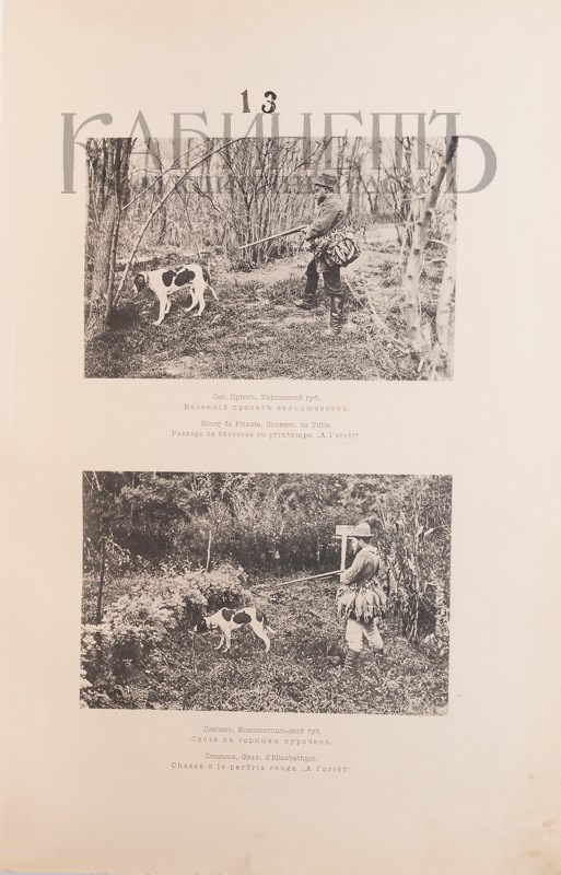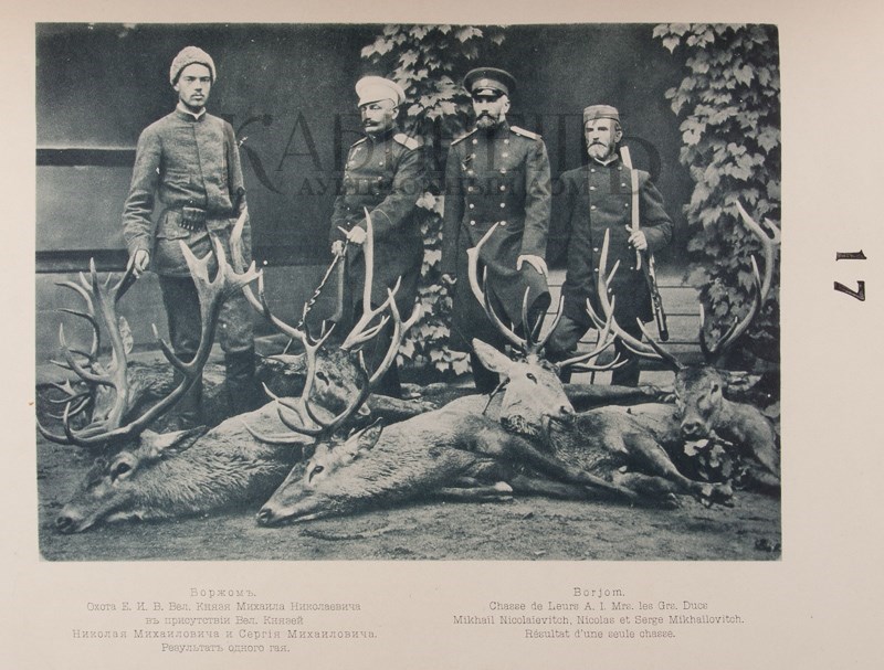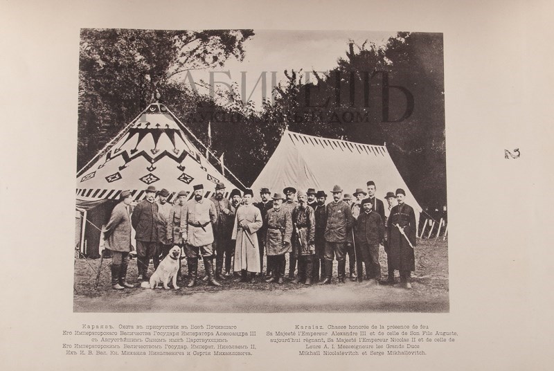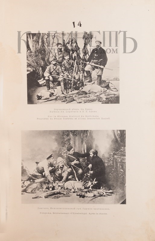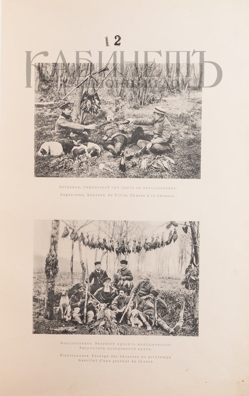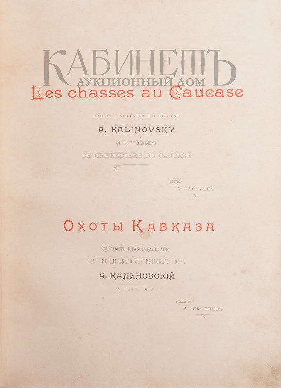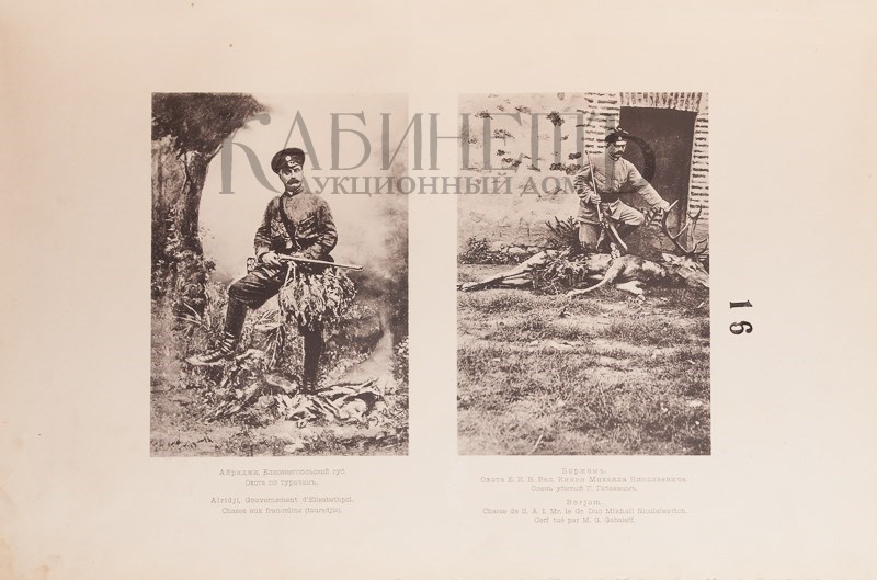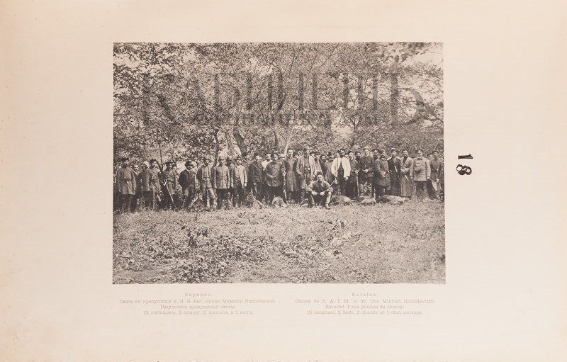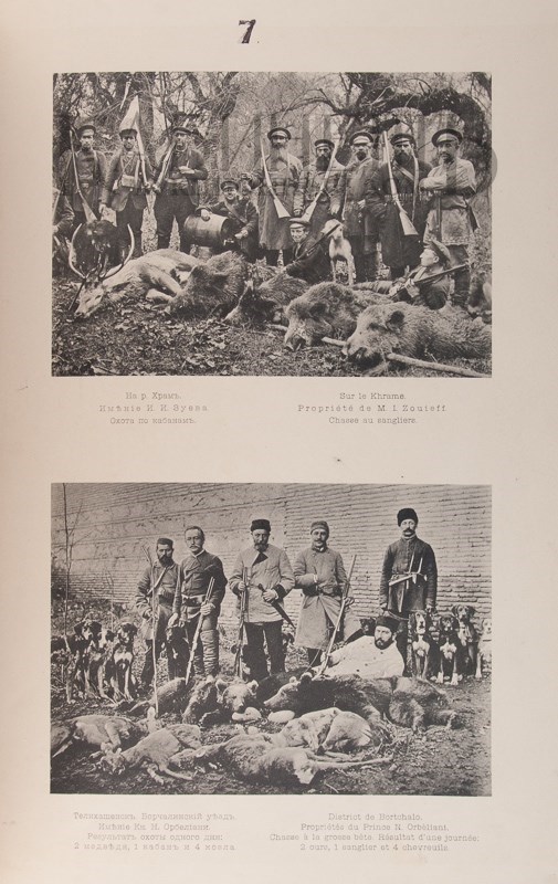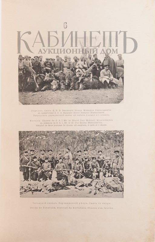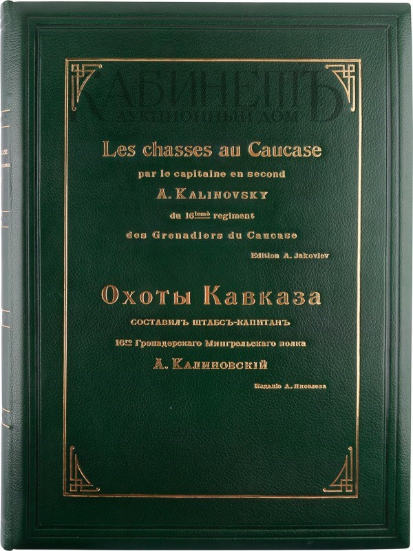 Роскошное иллюстрированное издание, приуроченное к Всемирной выставке 1900 г. в Париже. В книге содержится множество фотографий охоты с участием Великих князей и российского и кавказского дворянства, дается краткий очерк фауны Кавказа. Иллюстрации выполнены в технике фототипии. Текст параллельно на французском и русском языках.