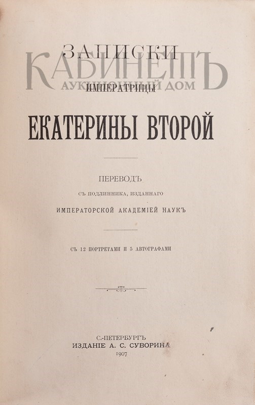 Записки императрицы Екатерины Второй. Перевод с подлинника, изданного Императорской Академией наук. С 12 портретами и 5 автографами. СПб., издание А.С. Суворина, 1907.
