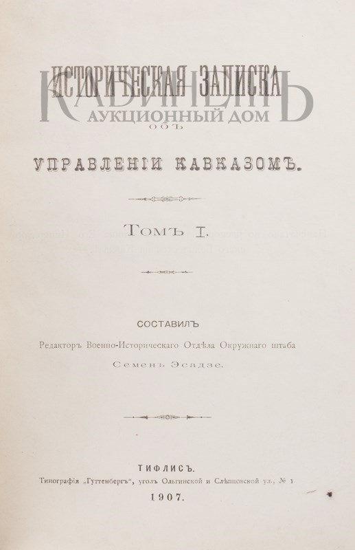 Эсадзе С. Историческая записка об управлении Кавказом. В 2 томах. Тифлис, типография «Гуттенберг», 1907.