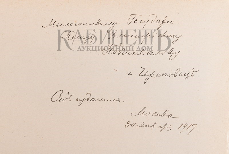 Автограф издателя – дарственная надпись на свободном листе переднего форзаца: «Милостивому Государю Петру Дмитриевичу Подшивалову г. Череповец. От издателя. Москва, 30 января 1917».