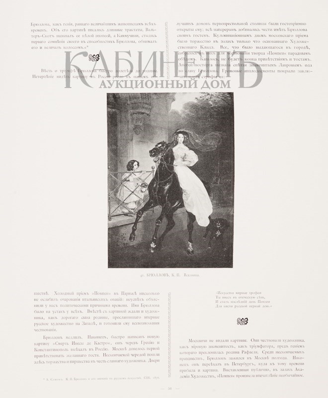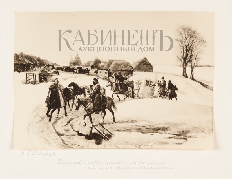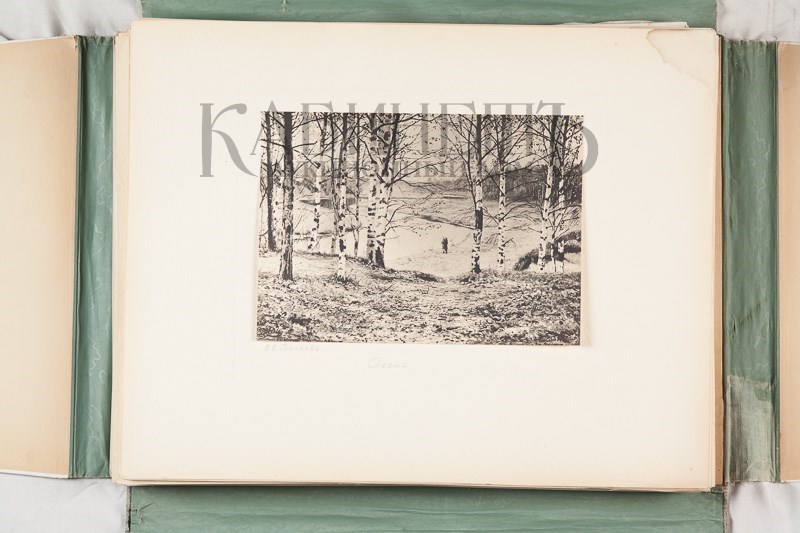 Экземпляр в издательских художественных коленкоровых переплетах с полихромным тиснением по верхним крышкам,тройной золотой обрез, незначительные потертости. Иллюстрации в папке подмочены, пятна отводы на уголках иллюстраций, некоторые кальки утрачены.