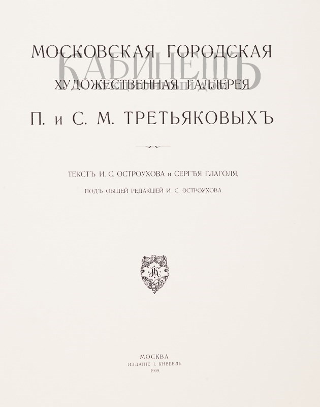Московская Городская Художественная Галерея П. и С. Третьяковых. Текст И.С. Остроухова и С. Глаголя, под общей редакцией И.С. Остроухова. В 2-х частях в одном переплете, папка с гелиогравюрами. М., издание И. Кнебель, 1909.