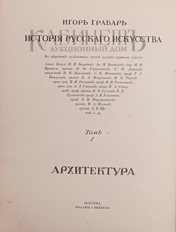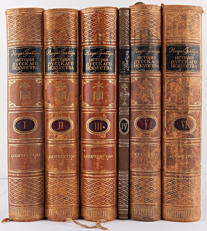 Экземпляр в пяти издательских составных переплетах, выпуск IV – в современном составном переплете (корешок стилизован под издательский переплет), сохранена издательская иллюстрированная обложка работы художника Е. Лансере. Крышки оклеены коричневым коленкором, тиснение золотом. На корешке из светло-коричневой кожи тиснение золотом. Форзацы из бумаги геометрического орнамента. Золотые обрезы. В очень хорошей сохранности. Редкие незначительные пятна, незначительные потертости корешков. Реставрация обложки выпуска IV (утрачены небольшие фрагменты). С. 91-94, 115-118, 123-126 в томе VI отходят от блока, некоторые листы подклеены. Пометка простым карандашом на титуле тома V, VI. Полустертый штамп на титуле и с. 17 тома VI.