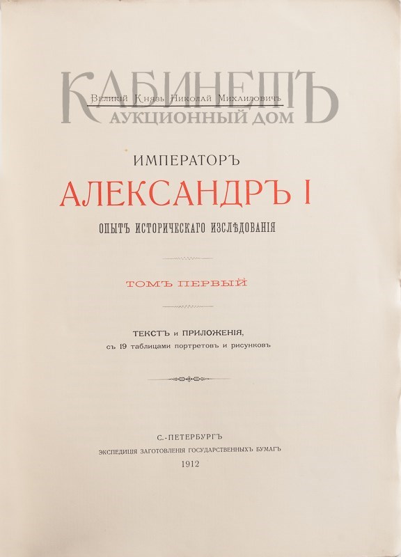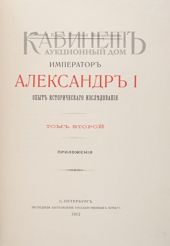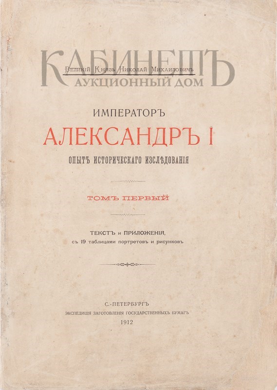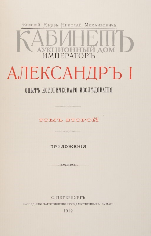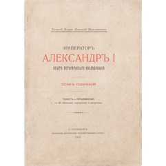 Великий Князь Николай Михайлович. Император Александр I. Опыт исторического исследования. Текст и приложения с 19 таблицами портретов и рисунков. В 2-х томах. СПб., Экспедиция заготовления государственных бумаг, 1912.