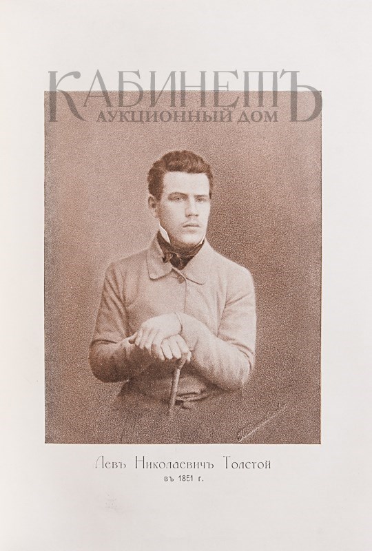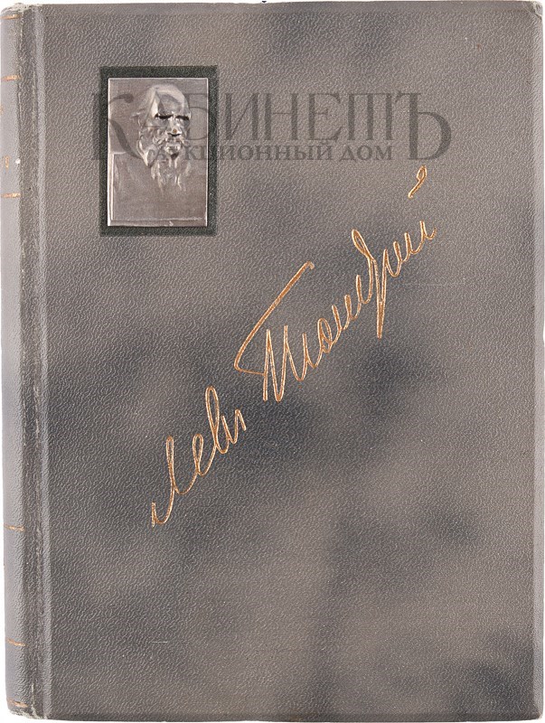 Экземпляр в издательских коленкоровых переплетах с золотым тиснением по корешку и верхней крышке, с металлической накладкой-изображением Л.Н. Толстого. Состояние хорошее.