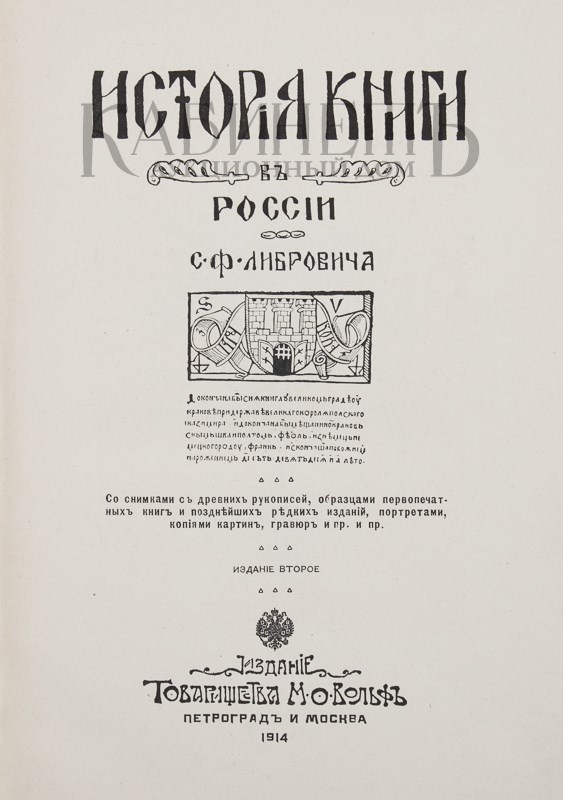 Либрович С.Ф. История книги в России. Пг. – М., издание товарищества М.О. Вольф, 1914.