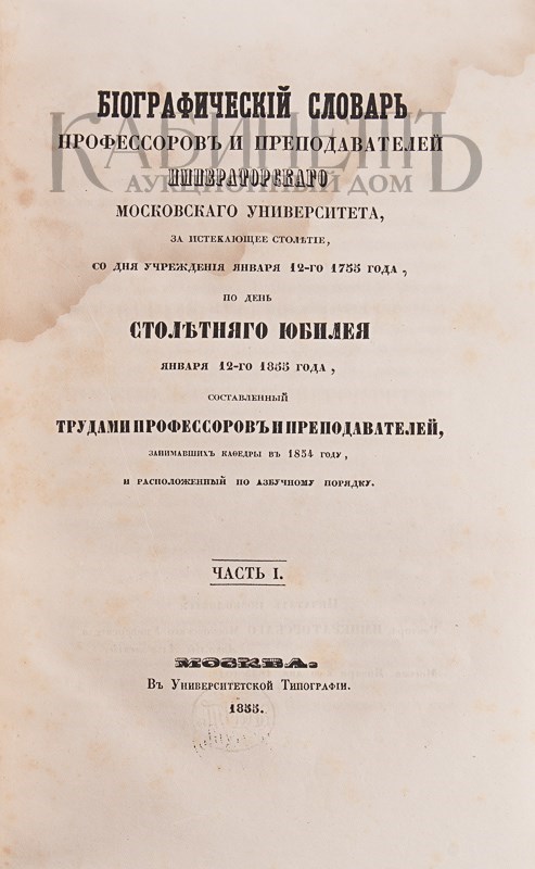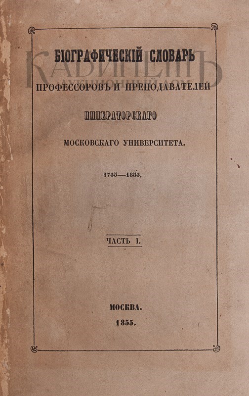 2) Биографический словарь профессоров и преподавателей императорского университета, за истекающее столетие, со дня учреждения января 12-го 1755 года, составленный трудами профессоров и преподавателей, занимавших кафедры в 1854 году, и расположенный по азбучному порядку. М., в Университетской Типографии, 1855. Формат издания: 24,5 х 16 см. XX, [6], 673 с.