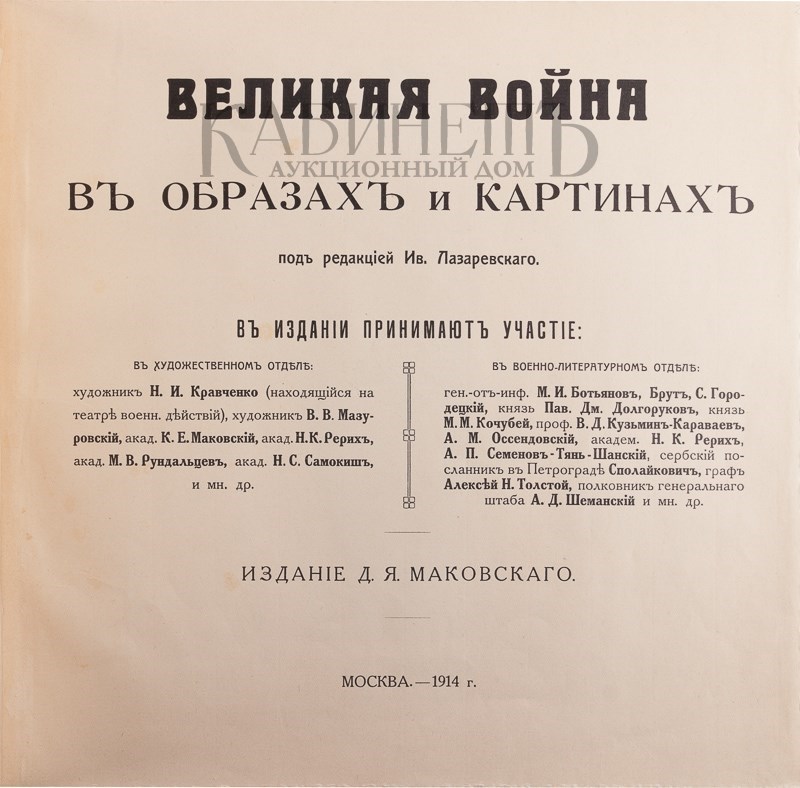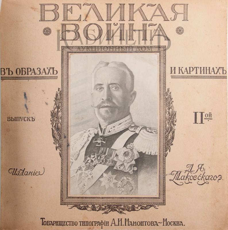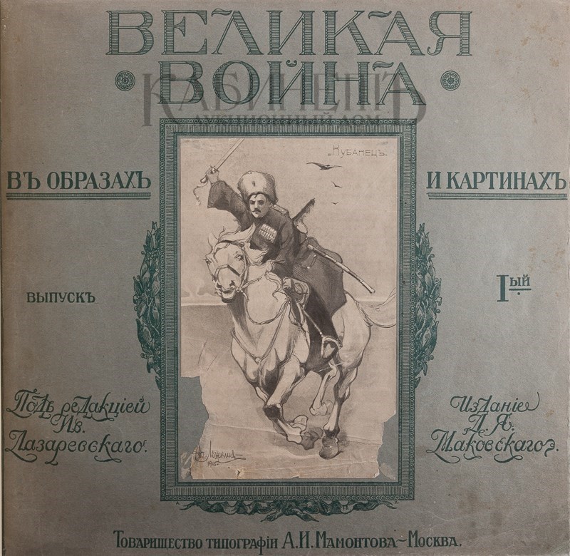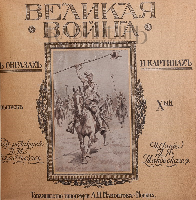 «Великая война в образах и картинах» – периодическое издание, выходившее с 1914 по 1917 год, всего было выпущено 14 выпусков. Особую ценность представляют фотографии десятков русских и европейских фотокорреспондентов. В художественном оформлении и написании текстов принимали участие видные представители художественного и литературного мира той эпохи: академики К.Е. Маковский и Н.К. Рерих, художники Н.С. Самокиш, В.А. Серов, в военно-литературном отделе сотрудничали генерал М.И. Ботьянов, поэт С. Городецкий, князь П.Д.Долгоруков, князь М.М.Кочубей, профессор В.Д.Кузьмин-Караваев, академик А.П. Семенов-Тян-Шанский, граф Алексей Н. Толстой, князь Евг. Трубецкой, С.Н. Булгаков и многие другие.