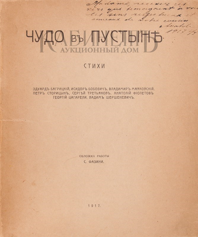 Чудо в пустыне. Стихи. Багрицкий Э., Бобович И., Маяковский В., Сторицын П., Третьяков С., Фиолетов А., Цагарели Г., Шершеневич В. Одесса, типография С.О. Розенштрауха, 1917.