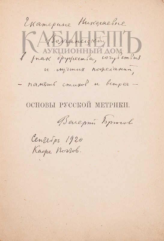 Автограф Валерия Брюсова Екатерине Ровинской-Волчанецкой.