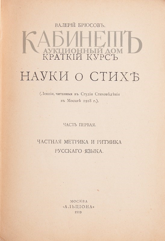 Брюсов В. Краткий курс. Наука о стихе. Частная метрика и ритмика русского языка. Часть I. М., «Альциона», 1919.