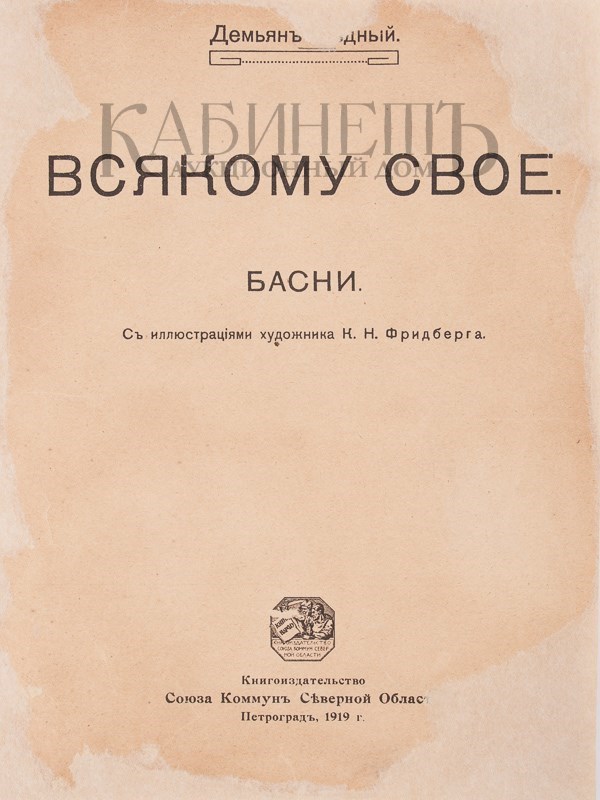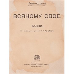 Бедный Д. Всякому свое. Басни. С иллюстрациями художника К.Н. Фридберга. Пг., книгоиздательство Союза Коммун Северной Области, 1919.